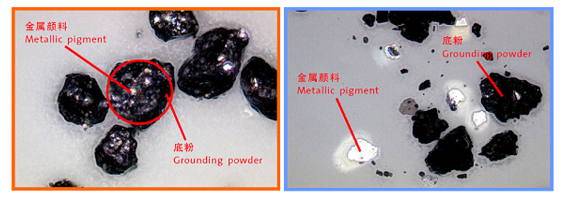 分散剂的选择则是整个绑定工艺控制的亮点,一个有效的分散剂能够稳定制造工艺,提高喷涂时的分散性,带电性能。为整个配方设计锦上添花,但也不能过分迷恋分散剂的作用,过分关注会产生适得其反的效果。以提升bonding工艺效率是各大厂商致力发展的方向, 稳定的生产工艺用于解决底粉和金属颜料间的附着问题,使得金属颜料与底粉连结在一起(见下图左).让金属颜料具有同树脂一样的带电性能,同时通过配方的设计,突破了金属颜料量的限制,在配方中添加量: 1 [%] ~ 20 [%].真正的能与油漆媲美。